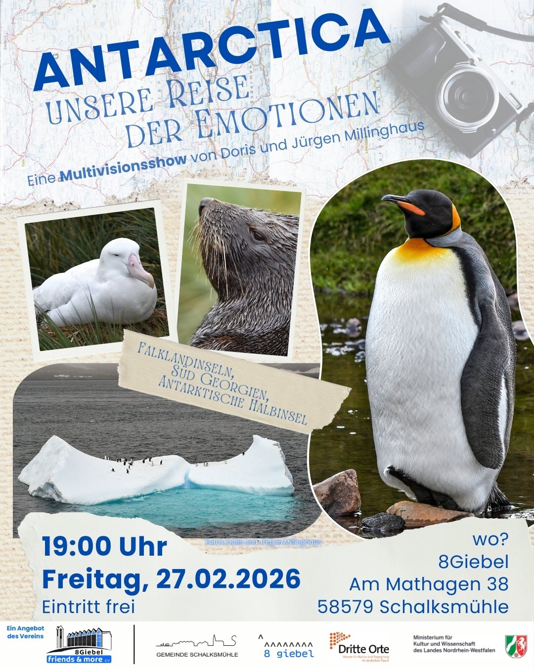 Doris und Jürgen Millinghaus präsentieren in dieser Multivisionsschau die fantastische Tierwelt und die beeindruckenden Landschaften, die sie bei einer Schiffsreise von Feuerland bis zur antarktischen Halbinsel erleben durften.